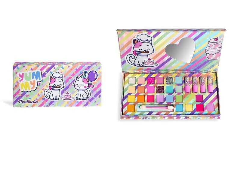 Ontdek de Yummy Make-up Kit! Binnenin vind je 20 betoverende oogschaduwkleuren, 4 mini-lipsticks voor een vleugje kleur en 4 schitterende glittercrèmes voor nog meer plezier. Maak je look af met 2 applicators voor een heerlijk zoete make-up.