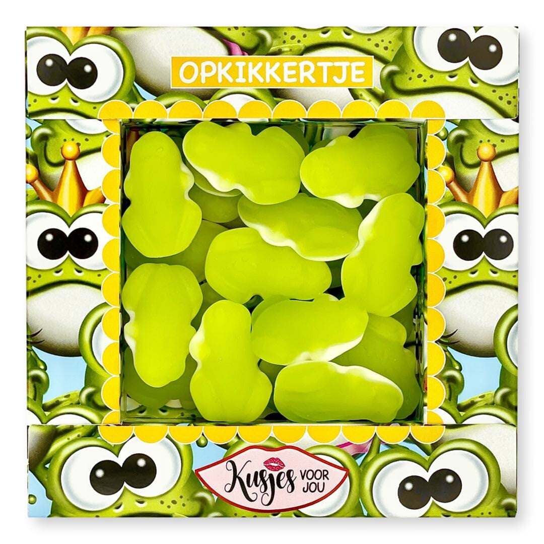 Snoep cadeaubox kikkers met tekst 'Opkikkertje'.