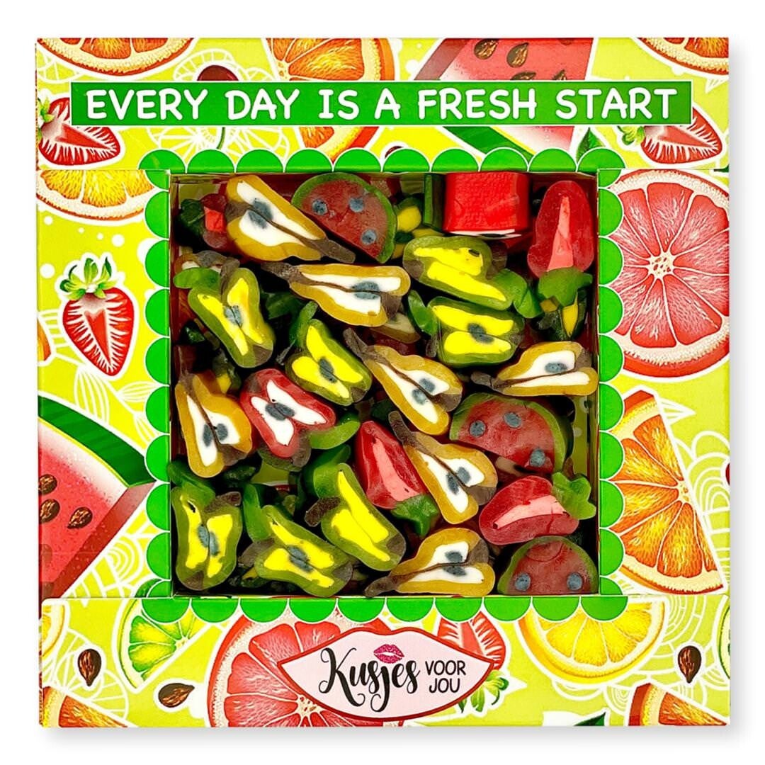 Snoep fruit mix cadeaubox met tekst 'Every day is a fresh start'.
