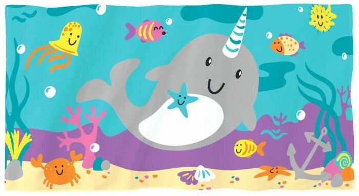 Wauw, dit is magisch! Wanneer je deze leuke narwal nat maakt, verandert hij in een 100% katoenen handdoekje 60x30 cm