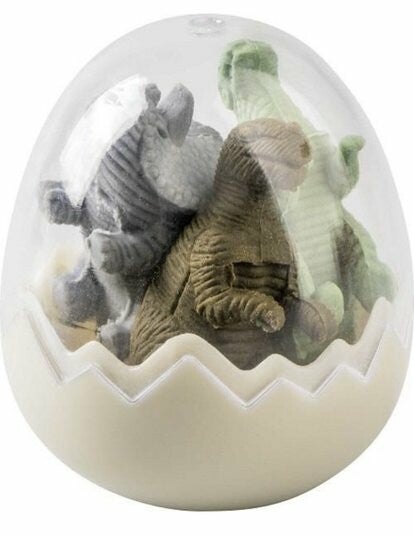 Een dino ei gevuld met 3 verschillende dino gummen. Afmeting ei: 4,5 x 4,5 cm.