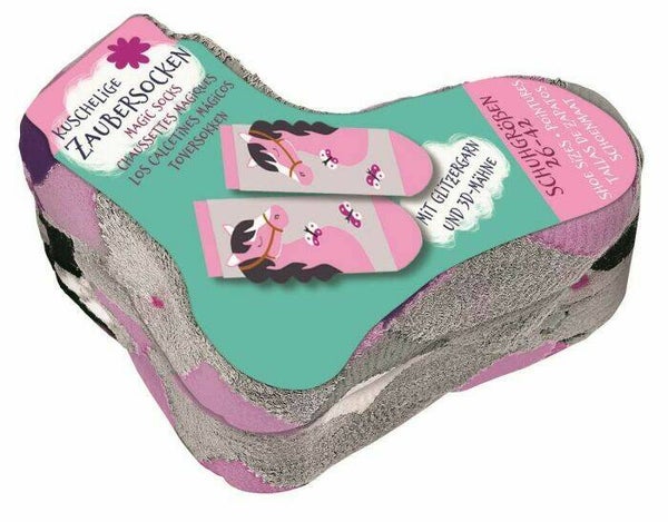 Hoe grappig! Leg dit cadeautje even in het water en dit kleine pakketje groeit uit tot een paar mooie paardensokken, voorzien van 3D manen en glitters. Gemaakt van katoen, polyamide, polyester, spandex en metaalvezels. Wasvoorschrift: 30 graden Geschikt voor schoenmaat 26-42