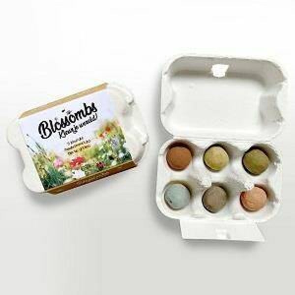 Super leuke Blossombs bloem bommetjes; 6 stuks mixed colours in mini eierdoosje! Blossombs zijn kleurrijke bloem 'bommetjes' gemaakt in Nederland met 100% natuurlijke ingrediënten en een biologische - speciaal voor bijen en vlinders - samengestelde zadenmix van wilde bloemen. Gooi de Blossombs overal en geef kleur aan je eigen buurt: in je tuin, in een pot op je balkon, op een braakliggend stukje grond, kale berm of langs de sloot! Het enige wat jij nog moet doen is wachten op een regenbui (of een gieter gebruiken) en de Blossombs doen de rest!