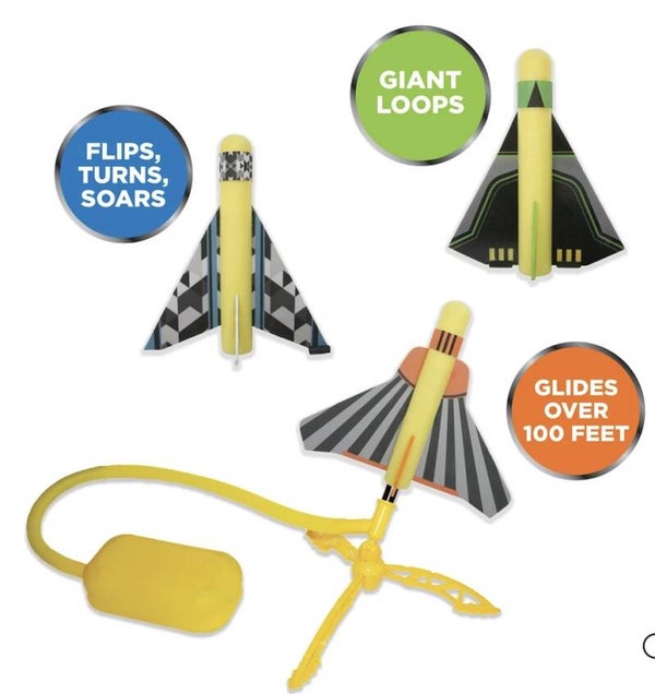 - Inclusief 3 stuntvliegtuigen, stevige lanceerstandaard en lanceerplatform met luchtslang.
